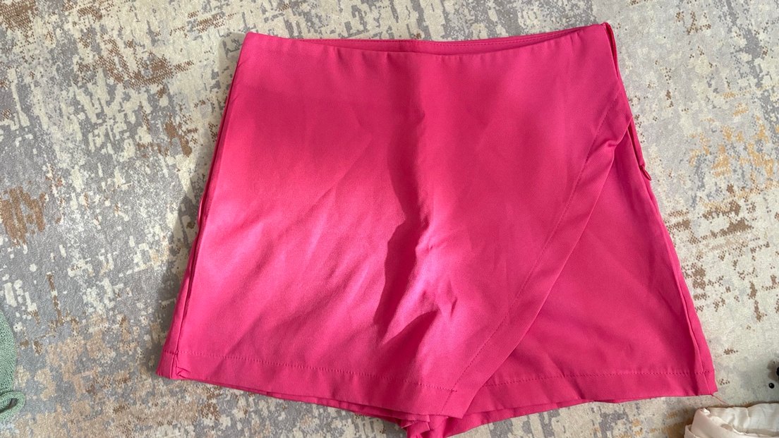 pembe renkte, şortlu tasarıma sahip, ipeksi kumaştan yapılmış dar kesim mini etek. Romantik akşamlar ve sokak stili için uygun.