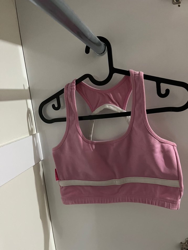 Pastel pembe renkli, kısa kesim ve sırtı yarışçı tarzında olan spor sütyeni, sokak giyimine uygun sade tasarıma sahiptir.