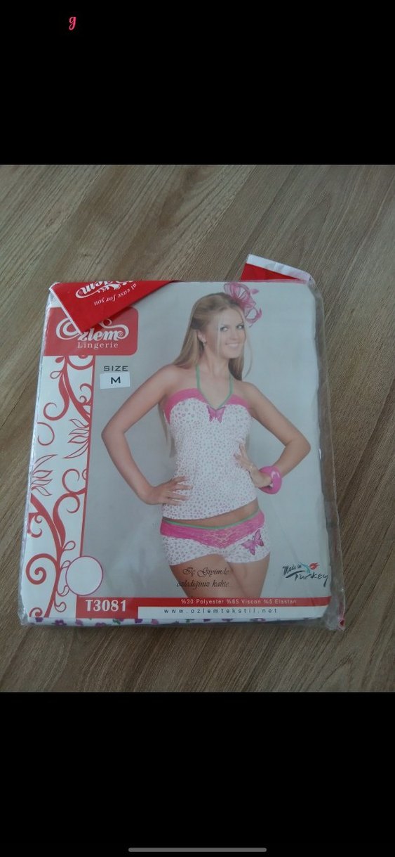 Pembe renkli, kısa mini boy ve straplez kollu, baskılı tasarıma sahip bohem stil pijama takımı. Yumuşak kumaştan, rahat kullanımlı.