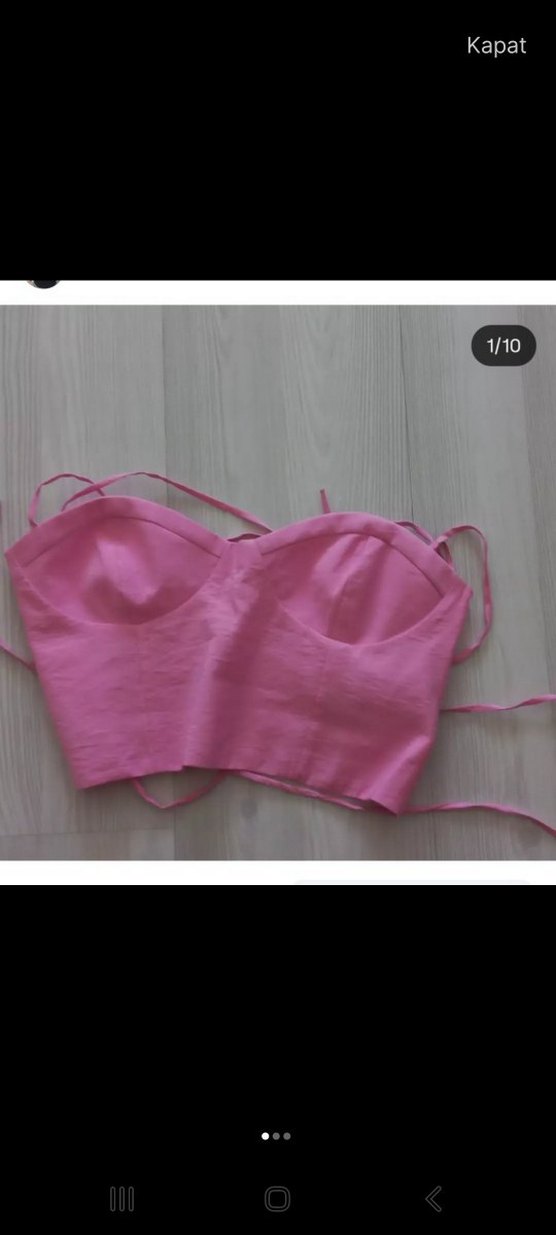 Pembe mini büstiyer, straplez yakalı ve ince askılı, sentetik dokulu kumaştan, parti için uygun şık ve dar kesimdir.