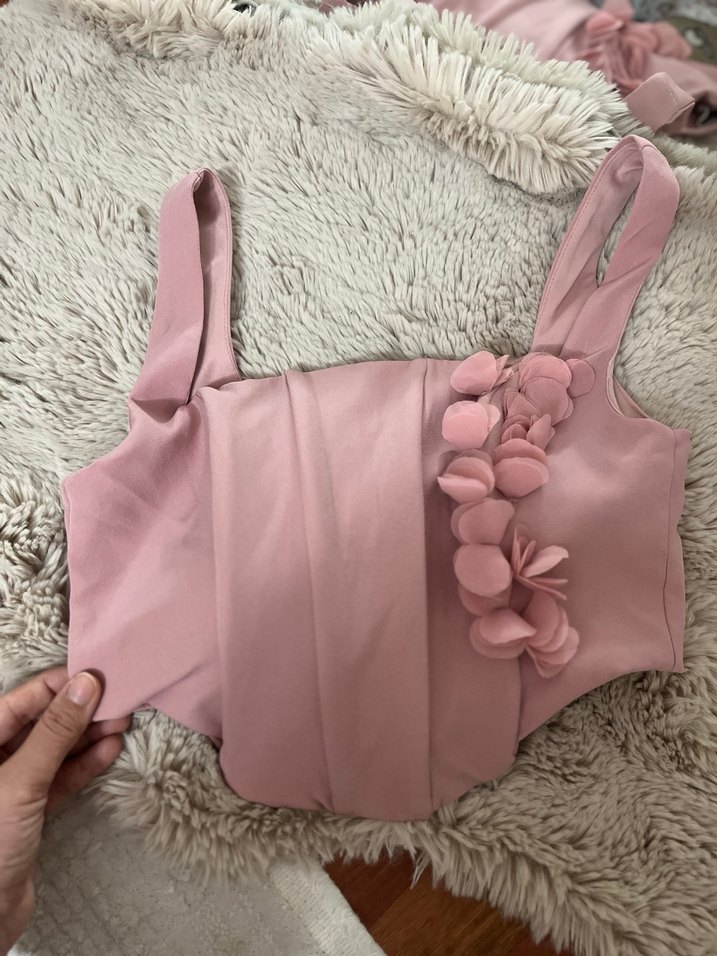 Pembe renkli, straplez yaka ve ince askılı, fırfır detaylı, kısa ve vücuda oturan sentetik kumaştan bustiyer. Korse tarzında büstiyer