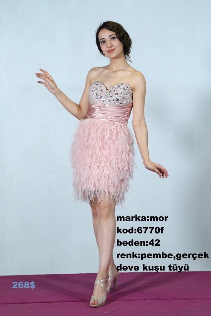 marka: mor kod: 6770f beden: 42 renk: pembe, gerçek deve kuşu tüyü fiyat: 2500 TL Gösterişli ve özel tasarımıyla dikkat çeken bu straplez elbise; üst kısmındaki taşlı kalp yaka gövdesiyle zarif bir parlaklık sunarken, eteğinde kullanılan gerçek deve kuşu tüyleri sayesinde hacimli ve lüks bir görünüm oluşturur. Bel kısmını saran saten drape kuşak, beli zarifçe vurgulayarak şık bir siluet sağlar. Hareketli tüy dokusu, ışık altında canlı ve etkileyici bir hava kazandırır. Özel davetler, nişan, mezuniyet ve butik organizasyonlar için ideal, mağaza stok ürünü olup kaliteli kumaş işçiliğine sahiptir.