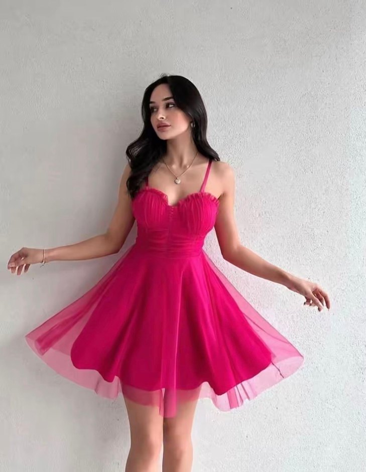 Pembe mini elbise, dar kesim ve drapeli detaylara sahip. İnce askılı, straplez yaka ve kısa boy ile cesur, göz alıcı bir görünüm sunar.