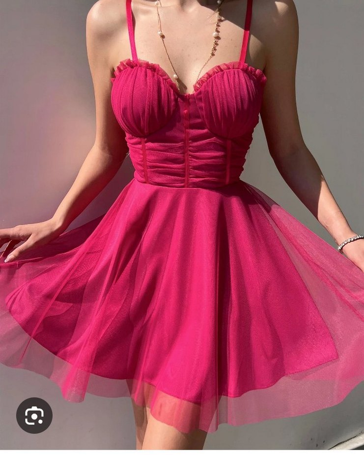 Parlak pembe mini elbise, fırfır detaylı, straplez ve ince askılı, vücuda oturan kesime sahip. Cesur parti kombinleri için uygundur. sifir urun#prenseselbise#tulluelbise#askilielbise#minielbise#pembeelbise