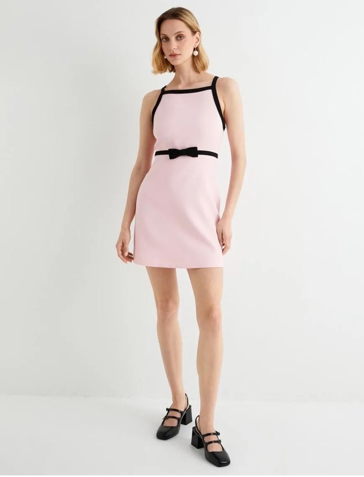 Pembe pastel tonlarda, kemerli ve ince askılı straplez kesime sahip, vücuda oturan mini elbise. Romantik akşamlar için uygun.