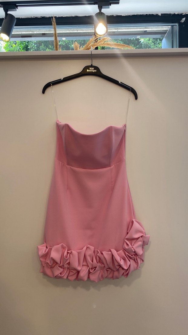 Pembe Mini Straplez Volanlı Abiye Elbise