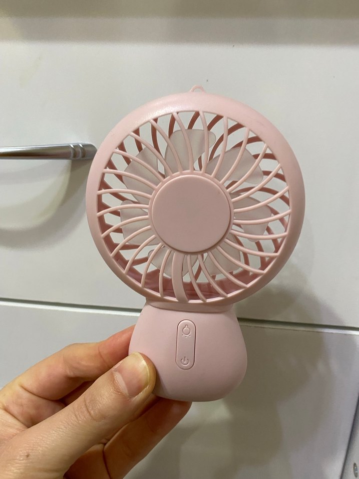 Açma ve kapama düğmeli, hafif pembe renkli taşınabilir masaüstü vantilatör. Kişisel kullanım için uygundur. ️