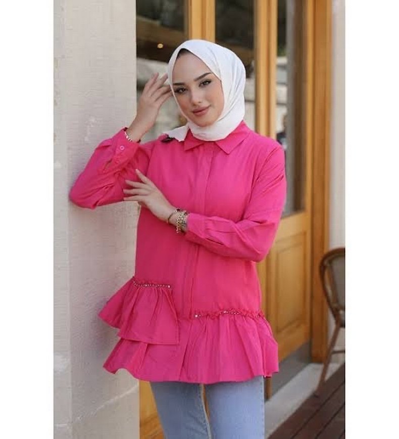 Pembe mini taşlı tunik, salaş kesim, uzun kollu ve yüksek yakalıdır. Etnik desenler ve fırfır detayları içerir, ipeksi kumaştan üretilmiştir, rahat bir sokak stili sunar.
