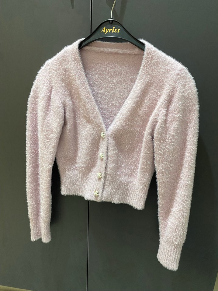 Pembe pastel renkte, uzun kollu, mini uzunlukta ve fitted kesimde yumuşak triko kumaştan yapılmış hırka. Yuvarlak yaka ve düğmeli tasarıma sahiptir.