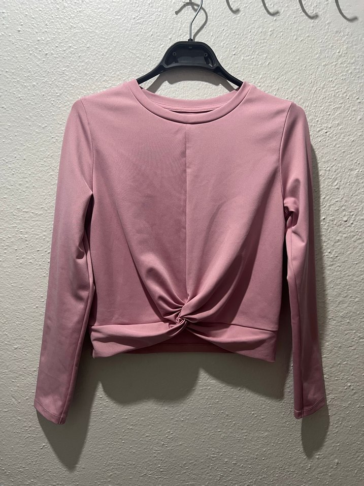 Pembe, uzun kollu ve bisiklet yaka, kısa boy ve bükümlü ön detaylı, şık ve rahat sentetik kumaştan mini sweatshirt.