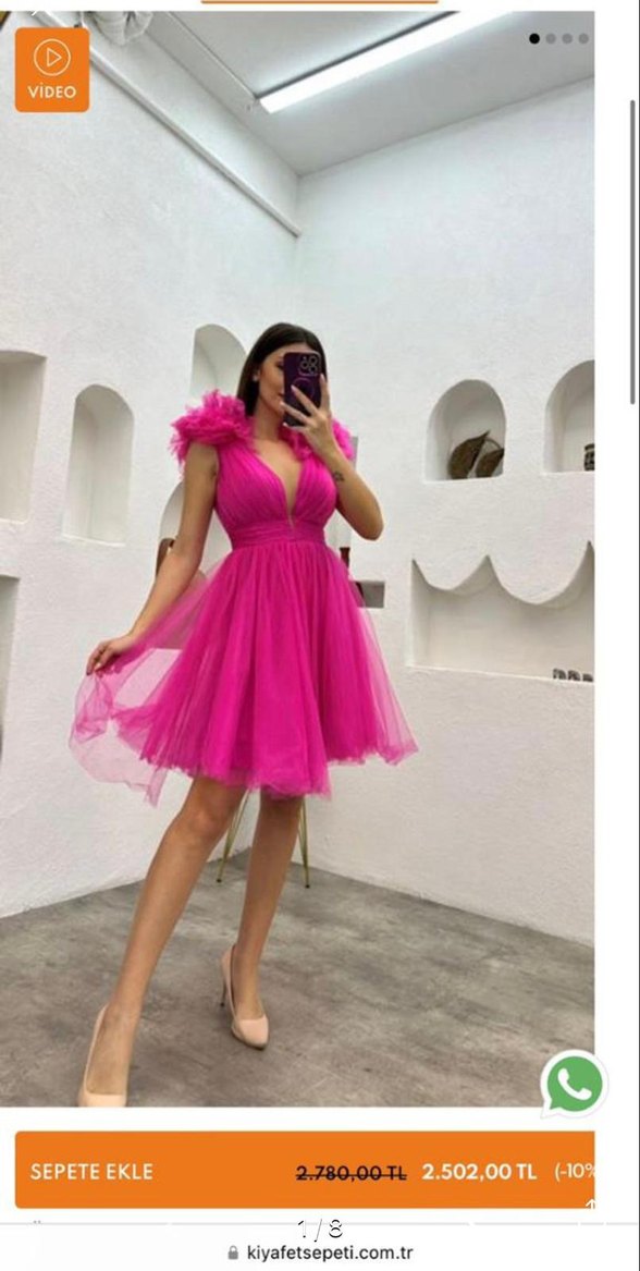 V yaka, fırfırlı omuz detaylı, mini boy, pembe tonlarında, salaş kesim abiye elbise. Sadece bir kere kınada giyildi harici hiç giyilmedi.