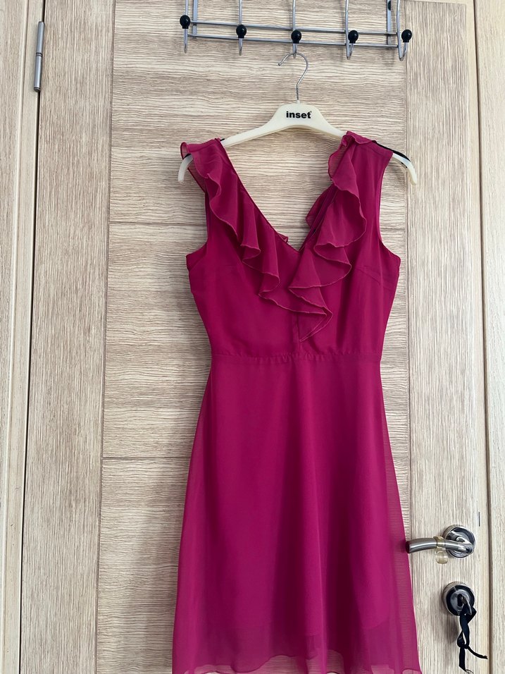 Pembe renkli, V yakalı ve fırfırlı detaylara sahip, kısa ve kolsuz, modern klasik tarzda abiye elbise.