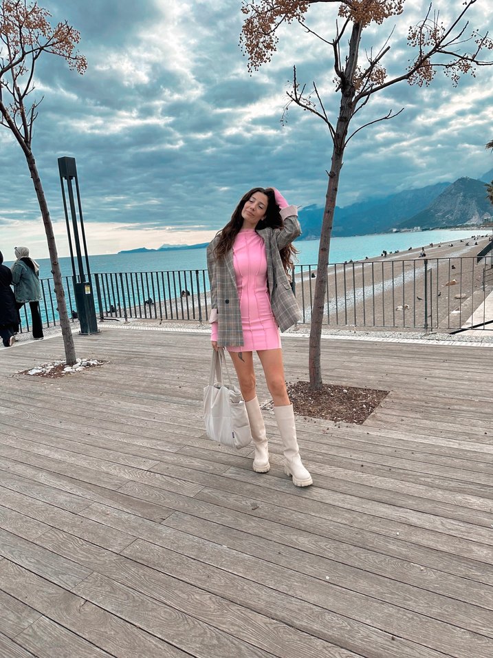 Yumuşak fleece kumaştan yapılmış, yüksek yakalı ve uzun kollu, pembe mini elbise. Pastel tonu ve sade tasarımıyla trend sokak stiline uygundur.