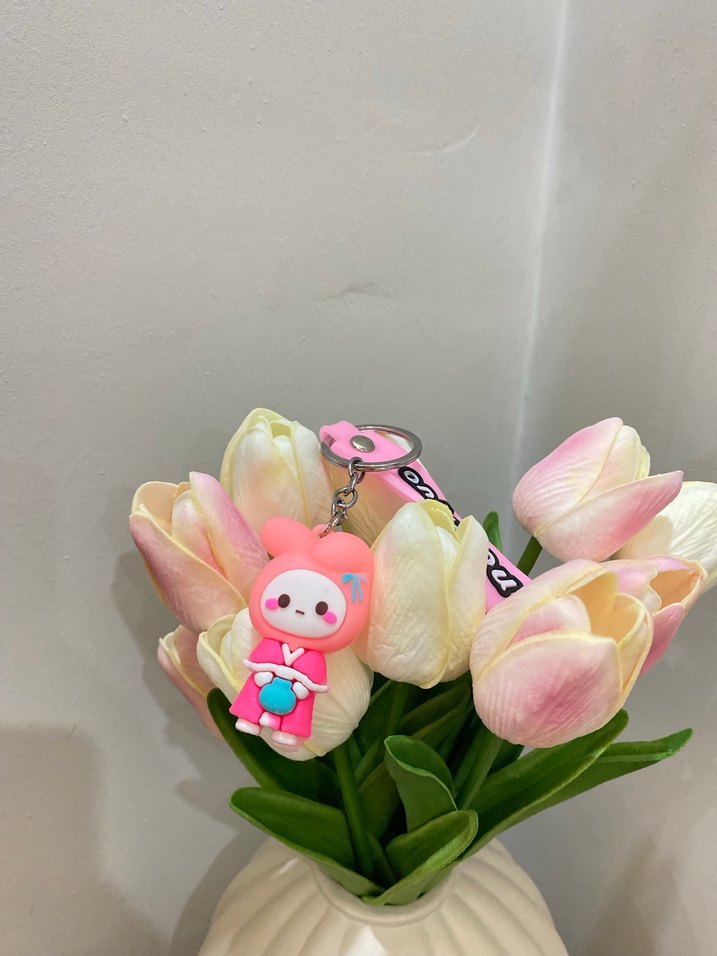Pastel pembe renkte, püskül ve sevimli karakter figürlü, minimal ve rock punk esintili anahtarlık.