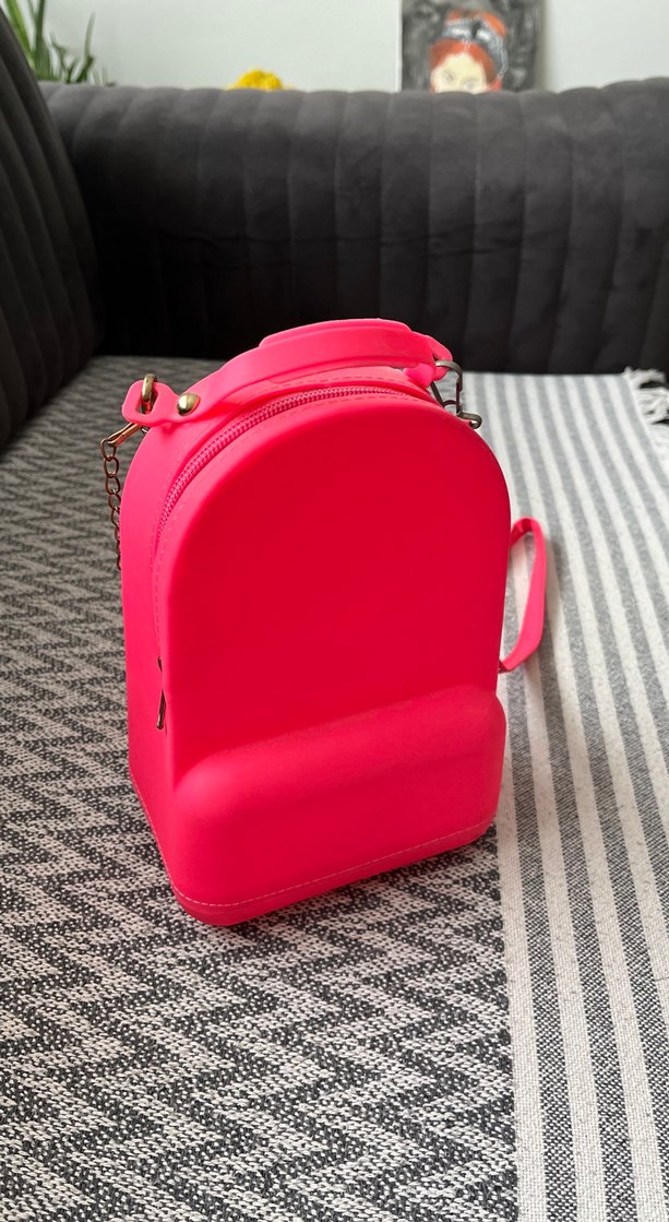 Renkli pembe plastikten yapılmış, fermuarlı kapamalı minimalist kadın sırt çantası. Desensiz, dış mekan ve sokak modasına uygun.