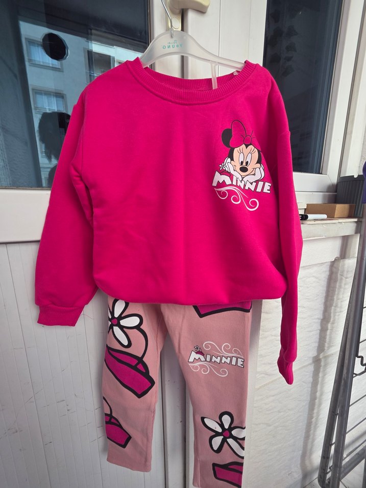 Renkli pembe sweatshirt ve pantolon takımı, bol kesim, uzun kollu ve örgü detaylıdır. Sweatshirt, bisiklet yaka ve Minnie baskılıdır, trend sokak stili için uygundur.