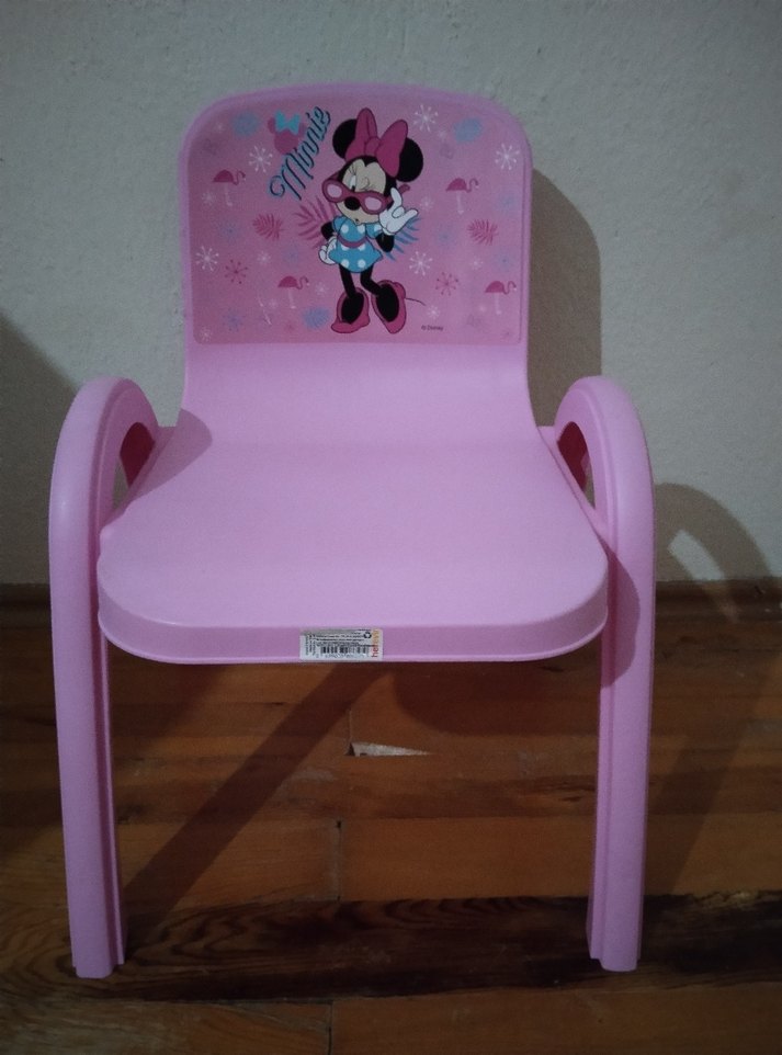 Pastel pembe renkte, sırt kısmında Minnie Mouse figürü bulunan çocuk sandalyesi. Dayanıklı kollu ve düzgün oturma yüzeyine sahiptir.