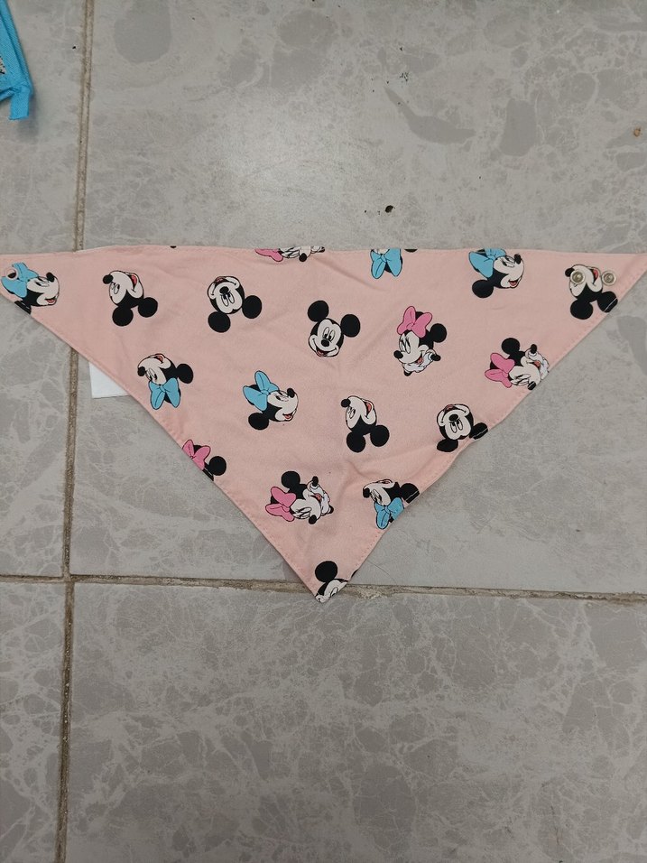 Pastel pembe renkte, mavi ve pembe fiyonklarla Minnie Mouse desenli üçgen bebek önlüğü. Yumuşak kumaştan yapılmıştır.