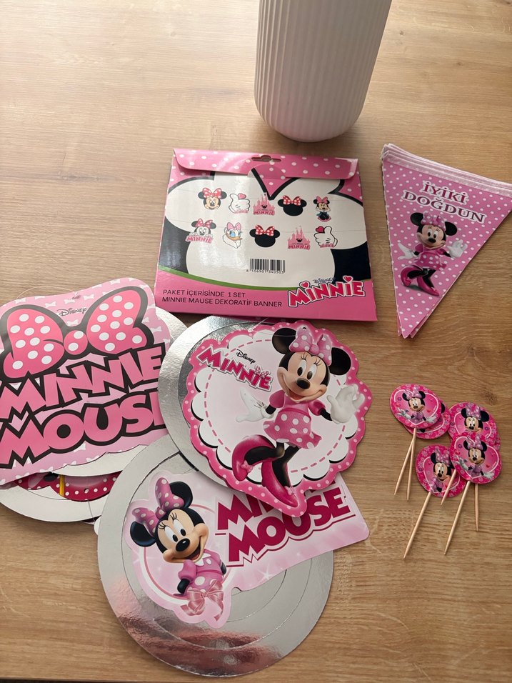 Açık pembe Minnie Mouse temalı parti süsleri, 6 adet Minnie Mouse kürdan, asılan spiral süsler ve karakter resimli bayraktan oluşur.
