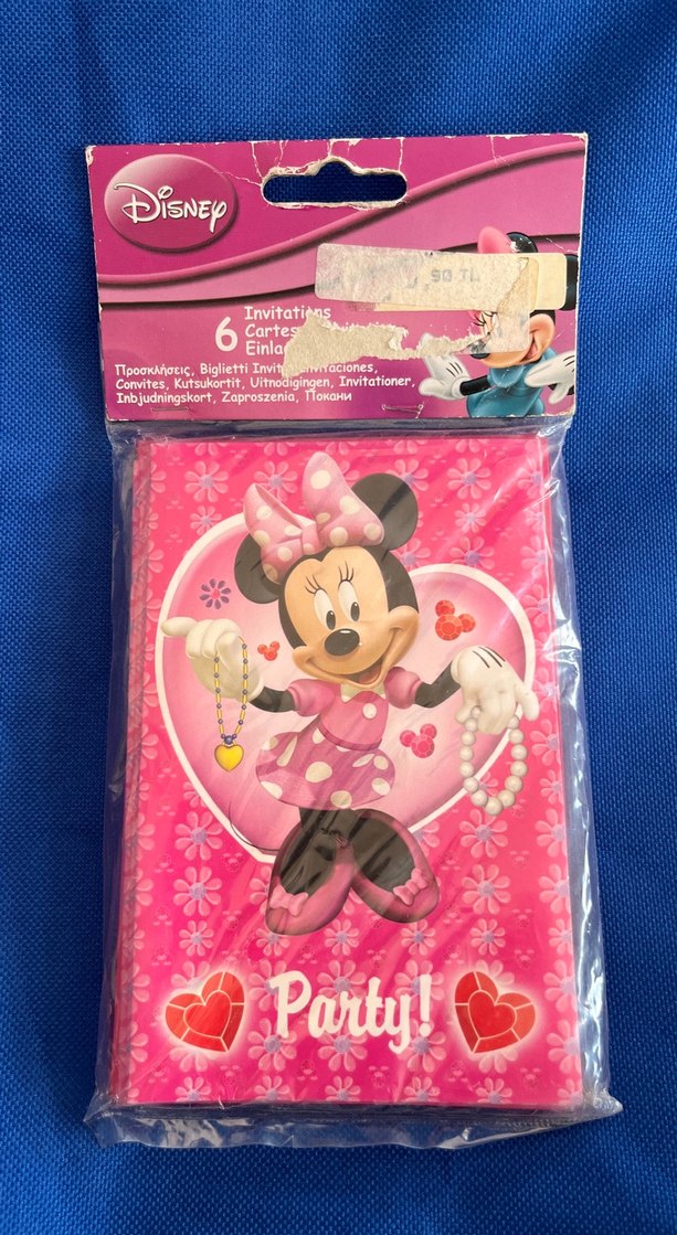 Pembe Minnie Mouse figürlü, "Party!" yazılı, pastel renkli 6 adet parti davetiyesi.
