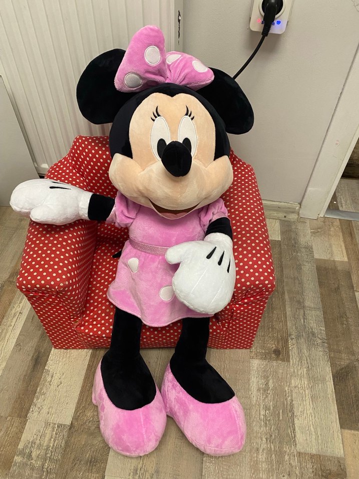 Renkli Minnie Mouse peluş oyuncak, pembe elbise, fiyonk ve ayakkabılarla. Yumuşak ve sarılmaya uygun.
