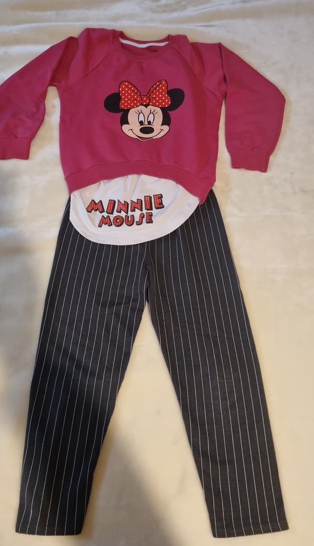 Pembe Minnie Mouse baskılı düğmeli sweatshirt ve gri çizgili bol kesim beli lastikli pantolon, rahat ve şık. kısa süre ve temiz kullanılmıştır. herhangi bir kusuru yoktur marka temsilidir. etiketi kesiktir. 6 / 7 yaş için uygundur. fotoğraftaki ölçüleri dikkate alarak alım yapınız iade kabul etmiyorum.