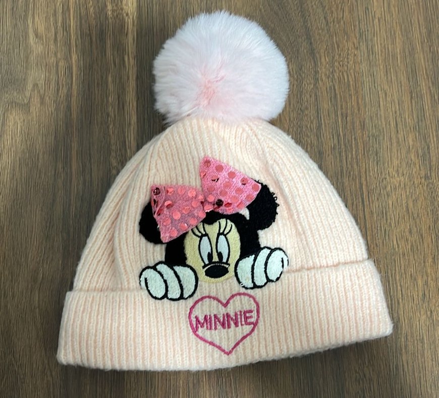 Renkli nakışlı Minnie figürlü, pembe örme çocuk bere, üstünde yumuşak ponpon bulunur. "MINNIE" yazısı nakışla işlenmiştir.