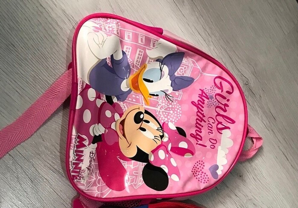 Renkli pembe çocuk okul çantası, Minnie ve Daisy figürlü ve üzerinde "Inything, Can Do" yazısı bulunur.