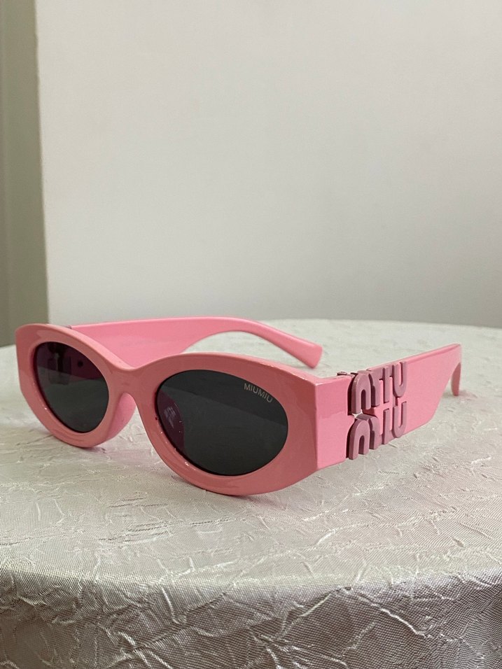 Zincir detaylı, canlı pembe çerçeveli MIU MIU güneş gözlüğü, rahat sokak stili için ideal.