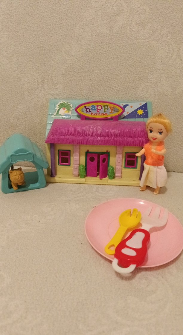 Pastel pembe renkte, küçük ev, bebek, köpek kulübesinde evcil hayvan ve tabak ile mutfak gereçleri içeren oyuncak seti. Ev üzerinde 'happy' yazısı bulunuyor.