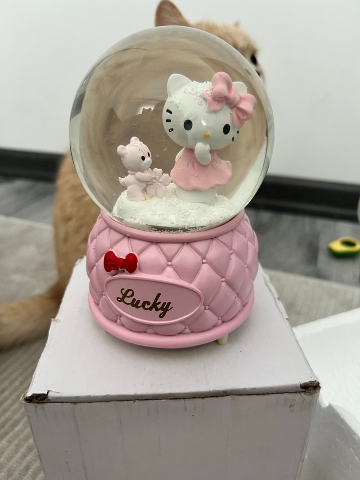 Pembe tabanlı, renkli müzikli oyuncak. Üzerinde 'Lucky' yazısı ve kırmızı fiyonk detayı bulunur. İçinde figürlü kar küresi vardır.