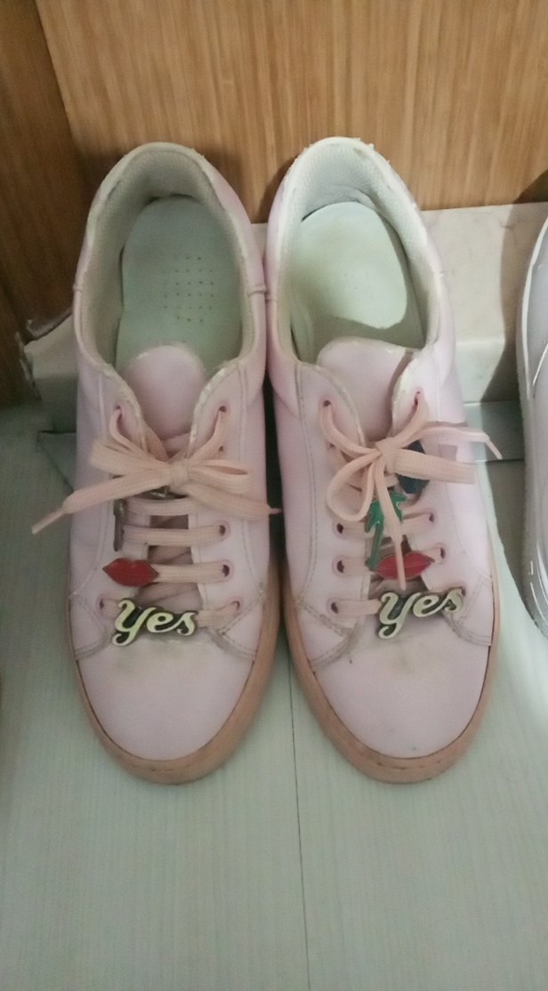 Pembe, nakış detaylı ve bağcıklı düz taban kadın spor ayakkabısı. 'Yes' yazılı aksesuar içerir, rahat sokak stili için uygundur.