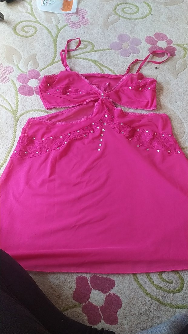 Bant askılı, pembe canlı renkte, nakışlı ve boncuk detaylı bohem tarzda, vücuda oturan midi uzunlukta gecelik.
