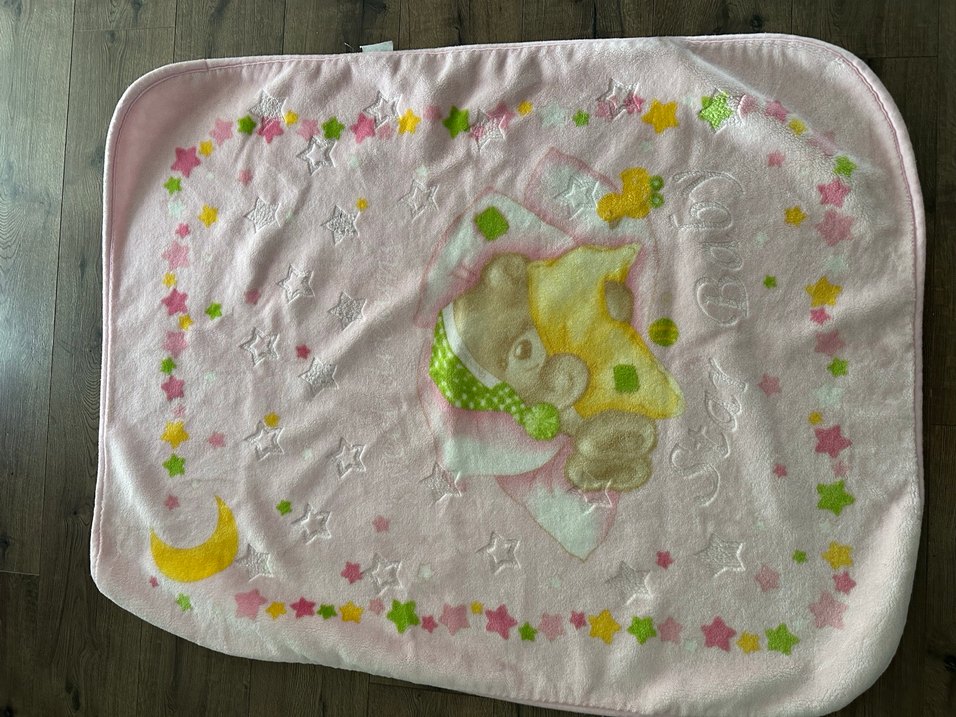 Yumuşak kumaş ve nakışlı yıldız desenlerine sahip pastel pembe çocuk battaniyesi. Sarı fiyonkuyla sevimli ayı motifi bulunur. Temiz kullanıldı sorunsuz