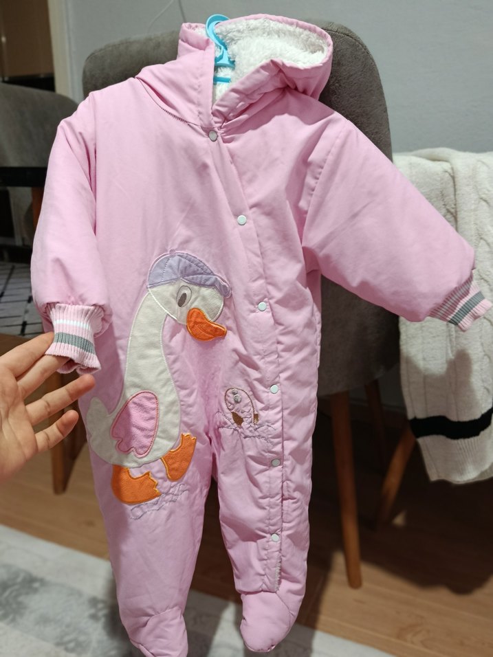 Pastel pembe renkte, yakalı ve düğmeli bebek kış tulumu. Nakışlı ördek deseni ve yumuşak astarı ile sıcak tutar. arka kısmında çok az sökük var