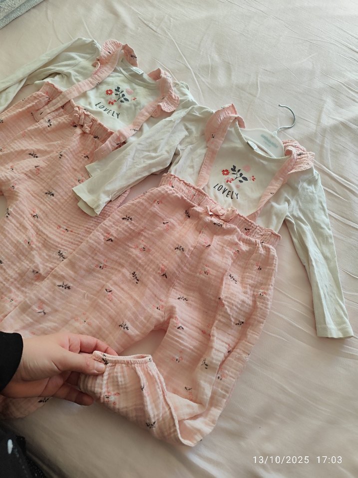 Nakışlı çiçek desenli uzun kollu üst ve fırfırlı, pastel pembe tulumdan oluşan bebek kız takımıdır. Yumuşak kumaşı konfor sağlar. tişörtteblekeler var tüm kusurlar belirtildi #ikiz