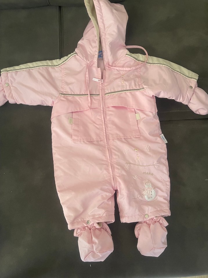 Nakışlı detaylara sahip pastel pembe bebek kız tulumu, çentikli yaka ve ön fermuar ile. Eldivenleri bağlıdır, ekstra sıcak tutar. ❄️