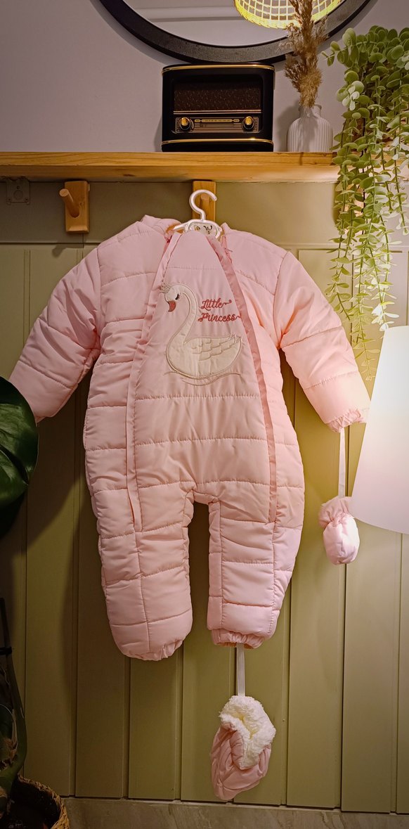 Sıfır ürün.şeker pembe renkte, fermuarlı ve nakışlı kuğu desenli, kesimli yakalı bebek kız tulumu. içi tamemen havludur. ürünün çıkarılanilir patik ve eldiveni vardır.