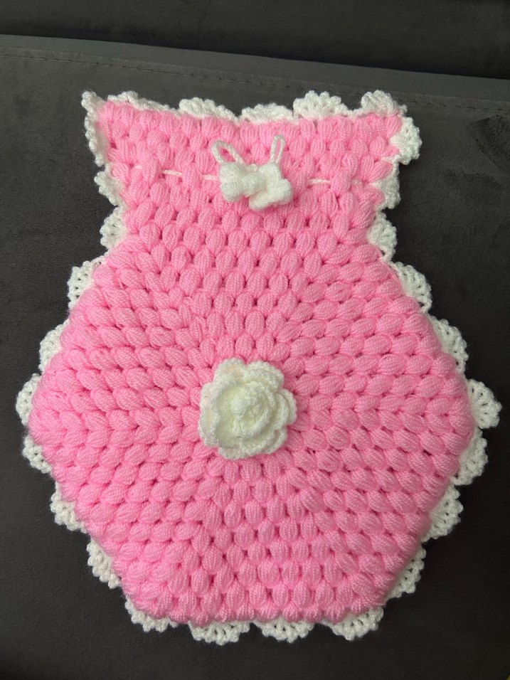 Pembe renkte, renkli nakış detaylı, yumuşak dokulu beyaz çiçek süslemeli bebek lifi ürünler el emeğidir