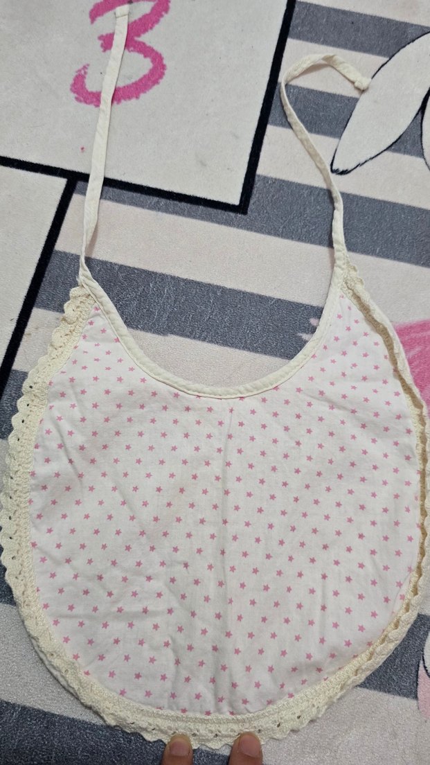 Pastel pembe renkte, zarif nakışlı ve yumuşak kenar detaylı bebek önlüğü, yemek zamanlarında bebeğinizi temiz tutar.