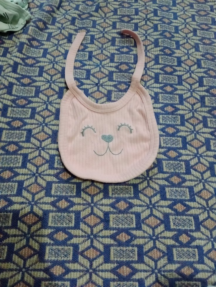 Yumuşak kumaştan yapılmış, nakışlı sevimli yüz desenli pembe bebek önlüğü.