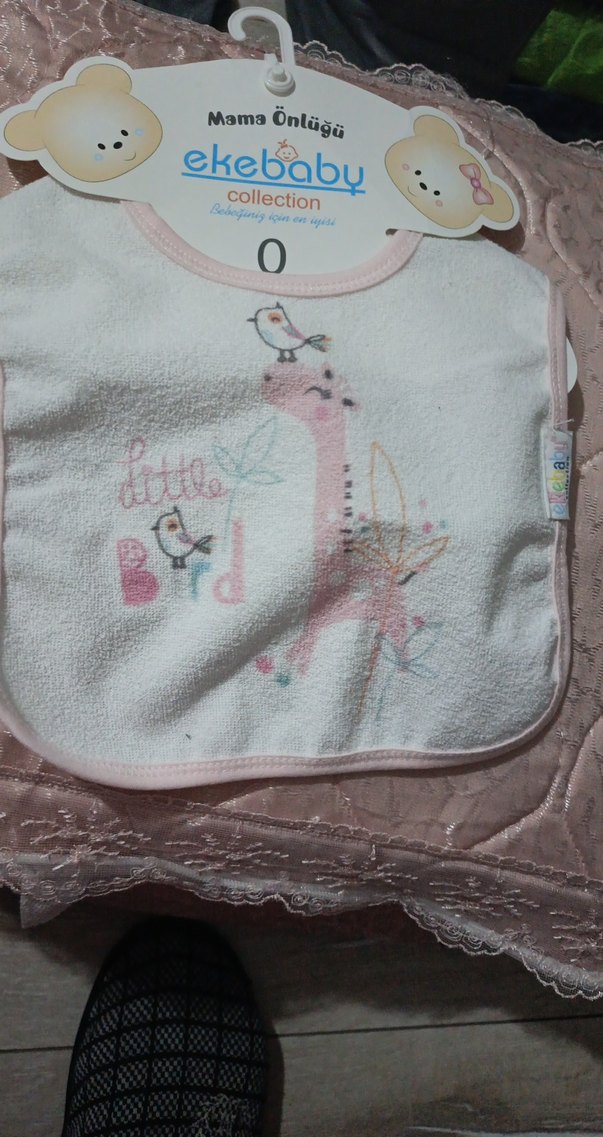 Nakışlı hayvan ve kuş desenli pastel pembe bebek önlüğü. Ekebaby koleksiyonundan yumuşak kumaşlı ve narin tasarım.