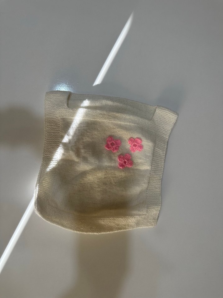 Pastel pembe nakışlı üç küçük çiçekli, yumuşak kumaştan bebek önlüğü. Beslenme sırasında nazik koruma sağlar.