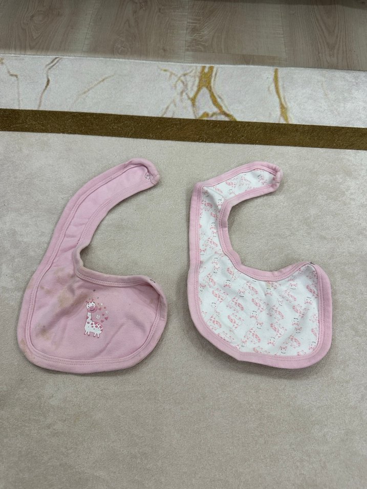 İki adet pastel pembe, nakışlı desenli bebek önlüğü seti. Biri düz pembe, diğeri desenli, yumuşak ve rahat kumaştan yapılmıştır. 2 adet gönderilecektir (3.ç) #bebek #giyim #zıbın #kıyafet