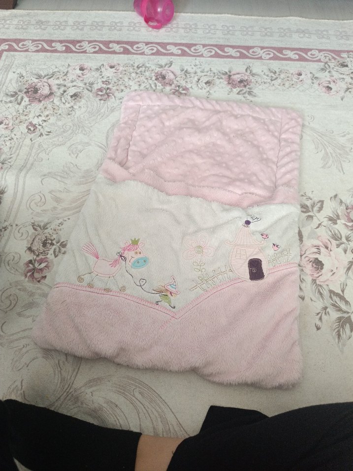 Yumuşak peluş kumaştan yapılmış, pembe pastel renkte, nakışlı peri masalı desenli bebek battaniyesi.