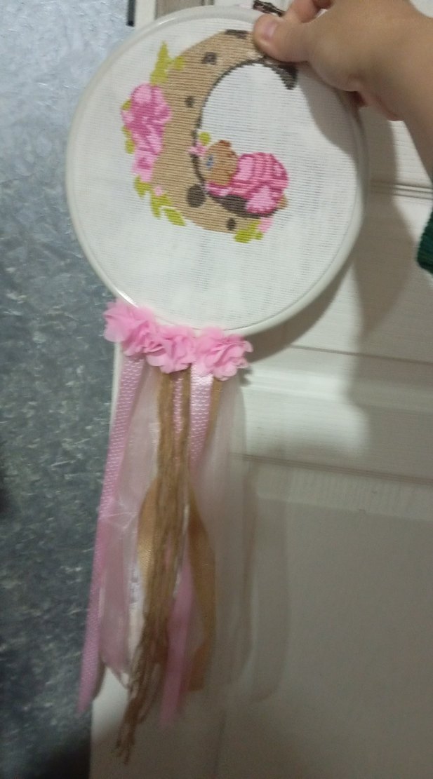 Pembe nakışlı, bebek figürlü dekoratif duvar süsü, yumuşak kumaş ve kurdele detaylarıyla hazırlanmıştır.