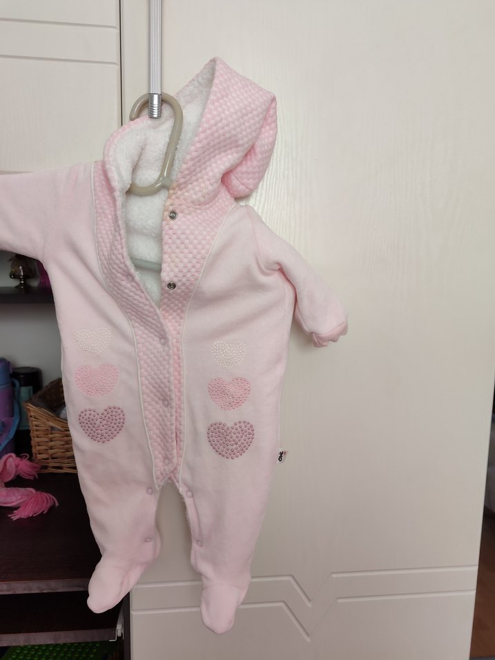 Pastel pembe renkte, düğmeli ve işlemeli kalp desenli bebek tulumu. Notlu yaka ve kapüşonlu, yumuşak ve sıcak kumaştan yapıldı. ❄️bir defa giydirdim. sadece yeni