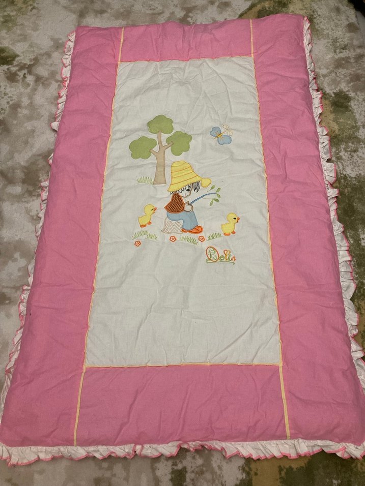 Pembe pastel renkte, çocuk ve ördek nakışlı bebek yorganı. Yumuşak kumaştan üretilmiştir.