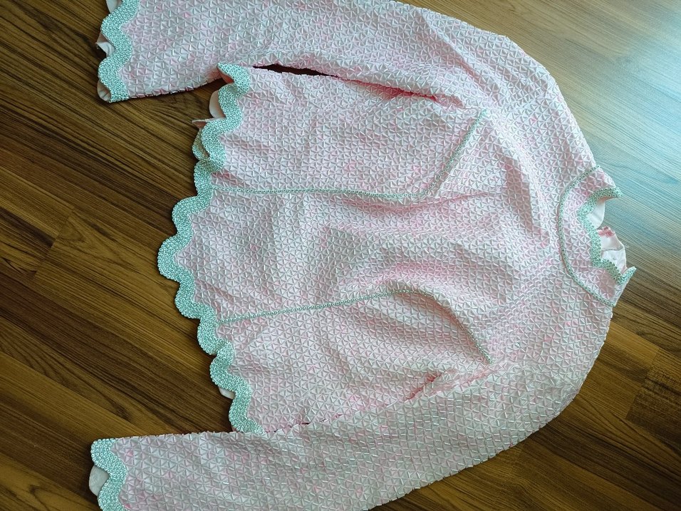 Pembe nakışlı, uzun kollu, yakası kesik bohem tarzda ve vücuda oturan kesimde.