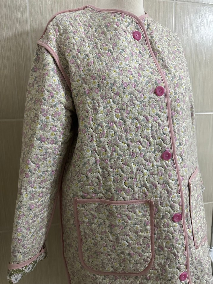 Pembe nakışlı, düğmeli uzun ve bol kesim kadın ceketi. Yumuşak sentetik kumaştan, yakası kesik ve uzun kollu, rahat bohem tarzda.